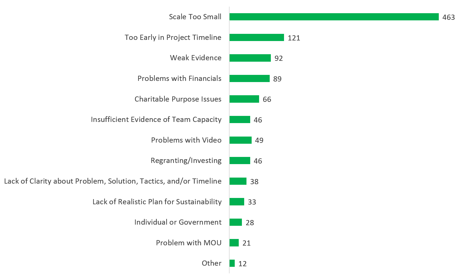 We found that even this basic review took time. And despite our efforts to create bright lines, sometimes there were questions that needed to be addressed in more detail or required judgement. For example, individuals were not eligible to participate, but attempted to do so by creating a sole proprietorship or LLC with only themselves on staff. While the call was for solutions that had some evidence to show they were effective, many applications sought to launch R&D processes for completely speculative endeavors which, if successful, would indeed make significant progress towards an enduring solution to a meaningful problem but were by nature almost completely devoid of supporting evidence.